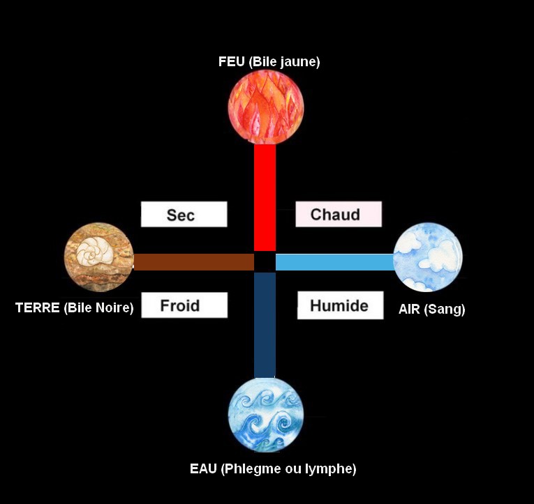 Les philosophes présocratiques ont établi que la matière était constituée de quatre éléments fondamentaux : le feu, l’air, l’eau et la terre. Ces quatre éléments sont présents dans tous les corps et comportent chacun deux qualités. La terre est froide et sèche, le feu chaud et sec, l’eau froide et humide et l’air chaud et humide.