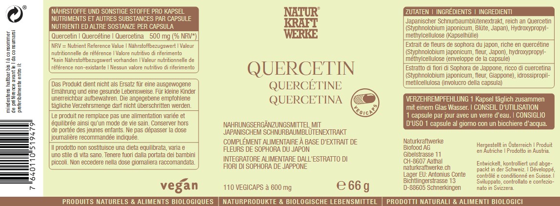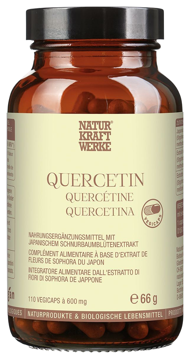 Quercétine naturelle extraite des fleurs du sophora du Japon (Styphnolobium japonicum). La forme végétalienne des gélules facilite leur utilisation. Fabriqué en Autriche, conditionné en Suisse dans des flacons en verre pour une protection optimale et une réduction des déchets plastiques.